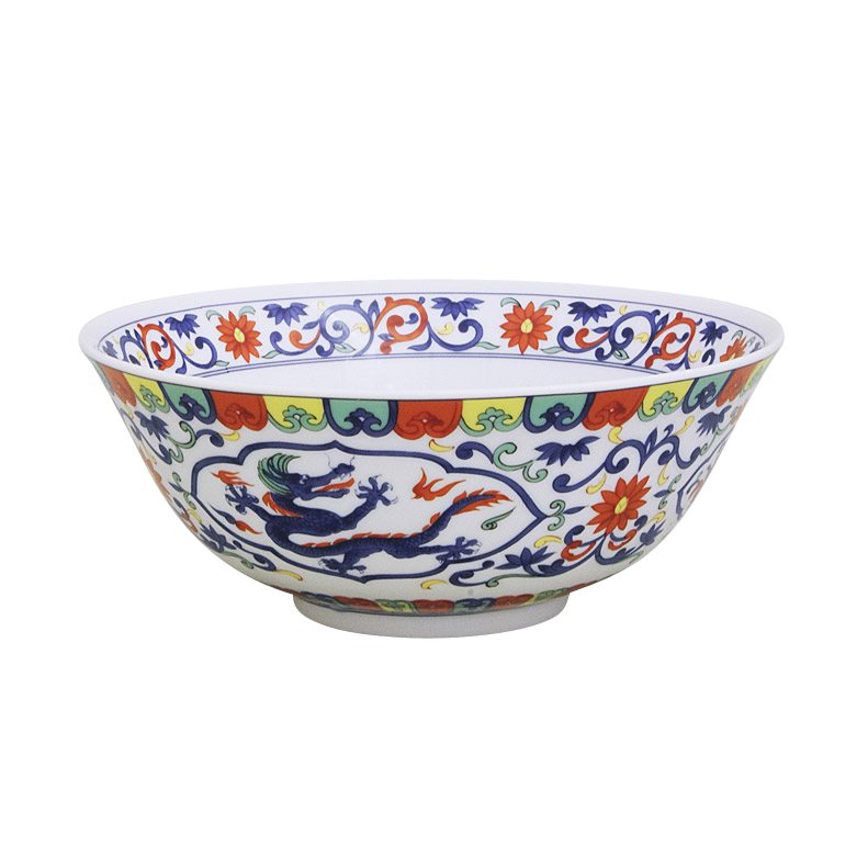 Die weiße Porzellan-Schale hat ein aufwendiges Drachendekor in den Farben Blau, Rot, Gelb und Türkis. Die Reisschale hat dabei einen Durchmesser von 13cm und eine Höhe von 7cm. Hauptaugenmerk liegt dabei auf dem blau-roten Drachen, welche zentral auf der Außenseite der kleinen Schale erkennbar ist. Im oberen und unteren Bereich auf der Außenseite befinden sich verschiedene Wimpel mit verschiedenen kleinen Symbolen.